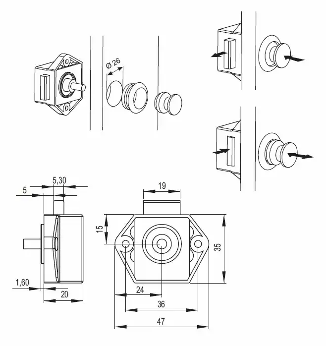| Push Button Lock, for 16 mm board, aluminum grey [493581] |